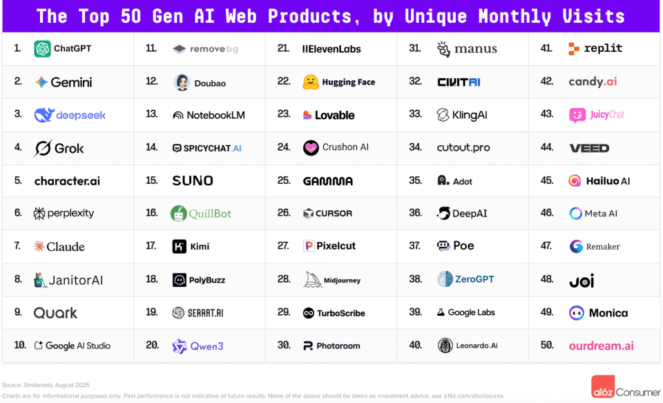 夸克Quark、豆包Doubao、月之暗面Kimi别离有96.2%、93.5%以及78.2%的用户来自中国,DeepSeek、夸克Quark别离位列第三名、第九名;谷歌旗下Gemini紧随其后。还有豆包Doubao、月之暗面Kimi、通义千问Qwen3跻身全球前二十名。但“中国正正在有越来越多的产物起头办事全球市场”。目前以“超等框“做为入口,被A16Z视为中国AI原出产品的三大从力代表,